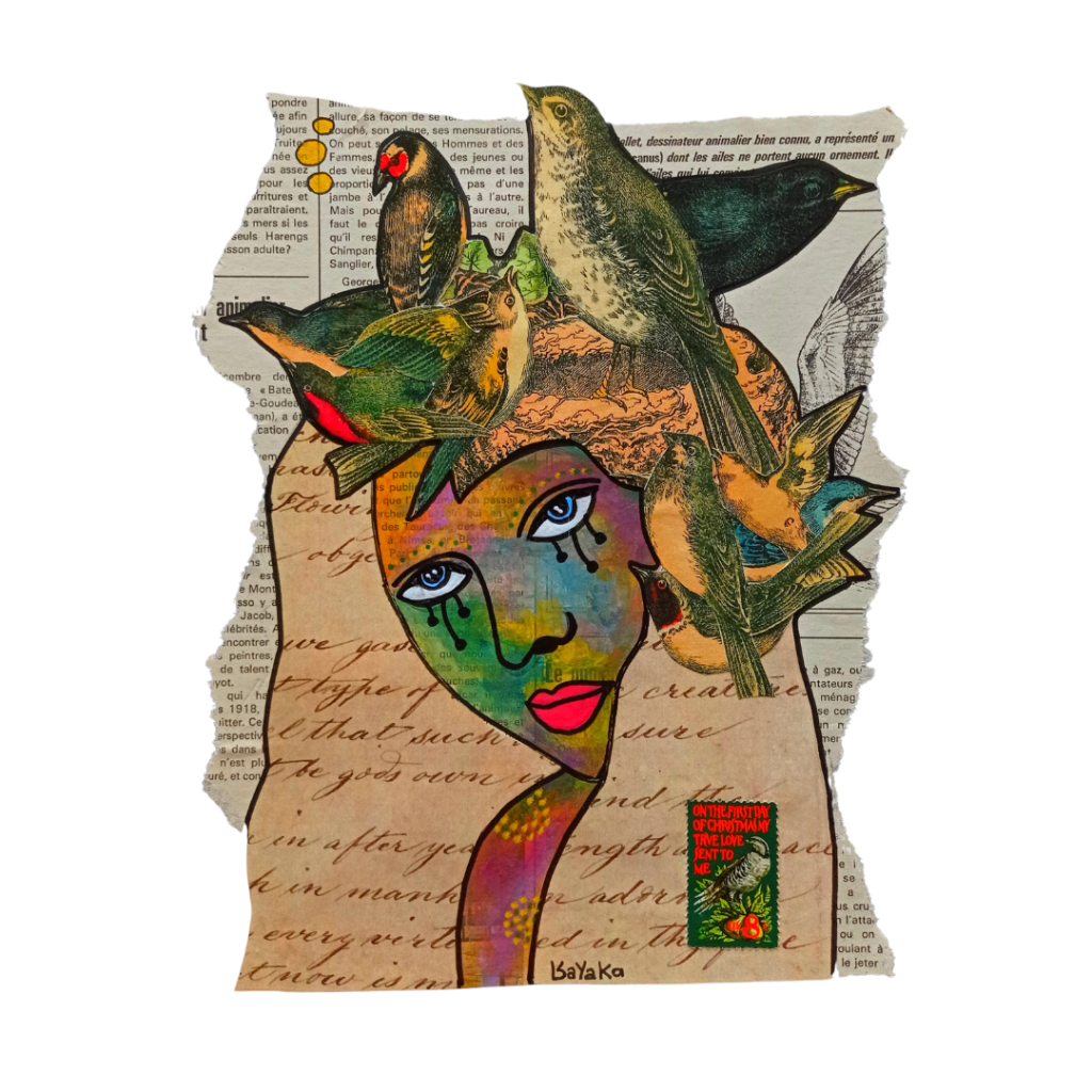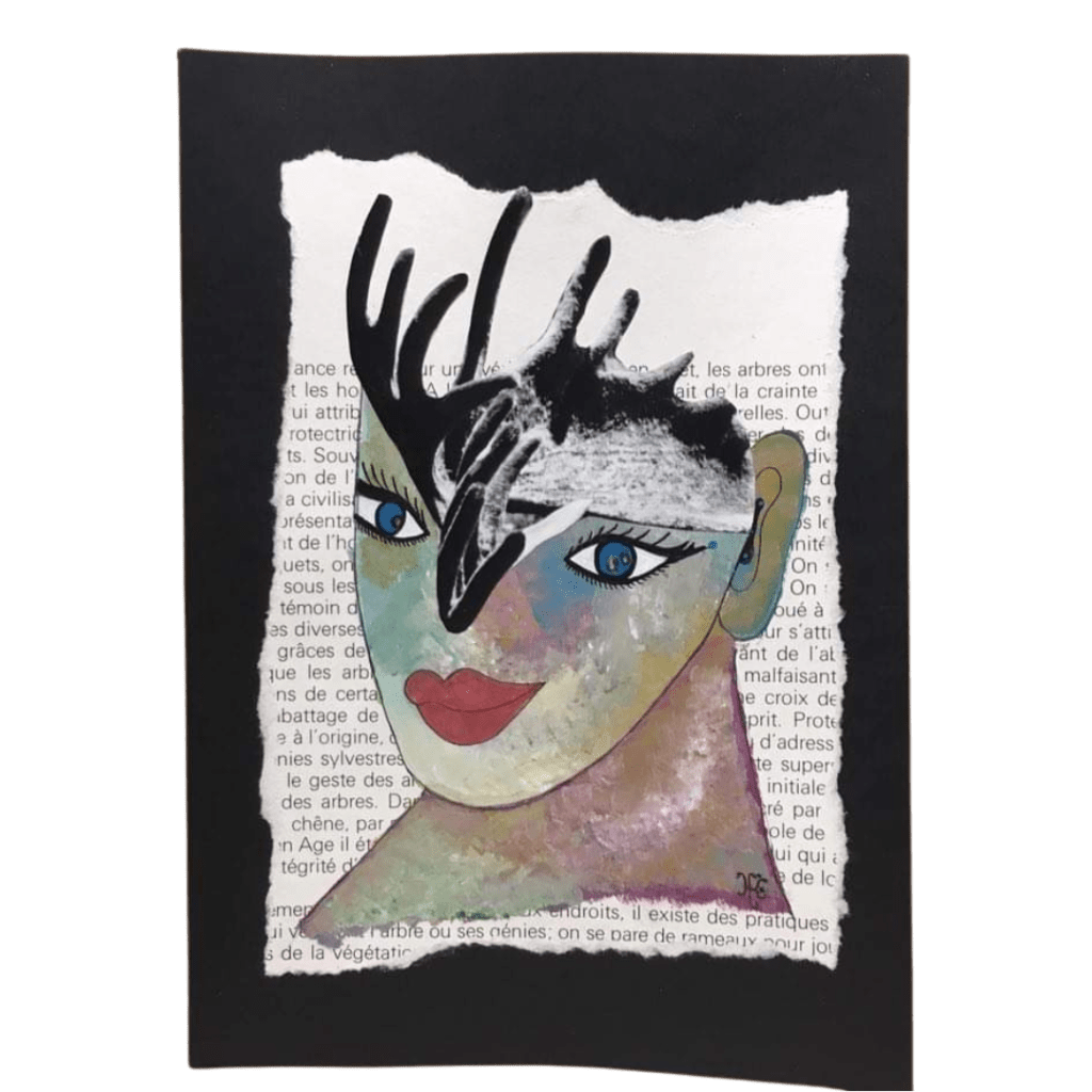 Un petit bout de table, derrière une baie vitrée, un rayon de soleil, sous une pluie battante automnale, les Sauvageonnes sont nées d’un hasard heureux. De belles images d’animaux, des couleurs en superposition, des livres anciens à recycler, une période de ma vie et de transformation interne, où la Nature m’appelle irrésistiblement. Les Duos sont des visages rencontrés ça et là et qui m’ont touchés par leur extravagante singularité. Les huîtres encore des huîtres chaque samedi au marché, des couvercles de bourriches d’huîtres au sol, jonchant nos pieds. Le regard qui se pose, des images qui apparaissent. Toujours mes émotions et le recyclage au cœur de mon processus.