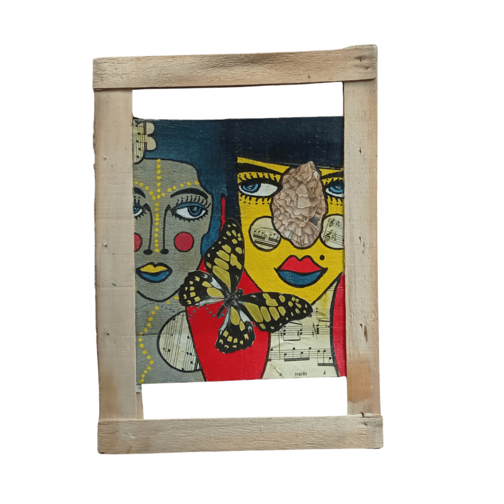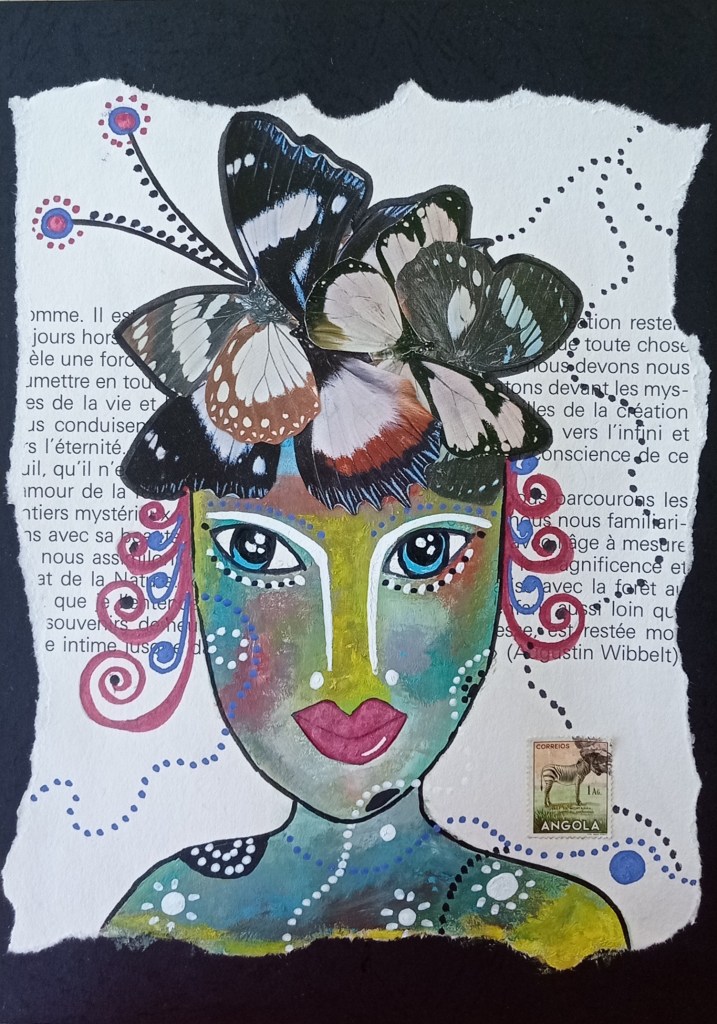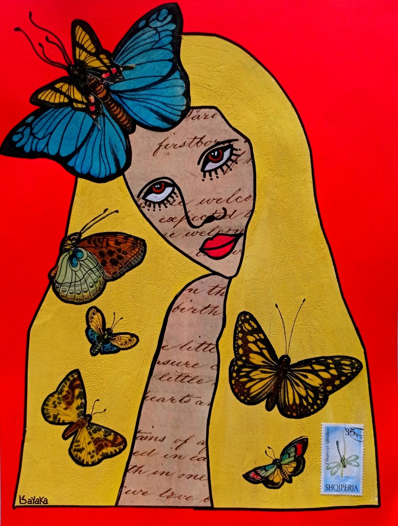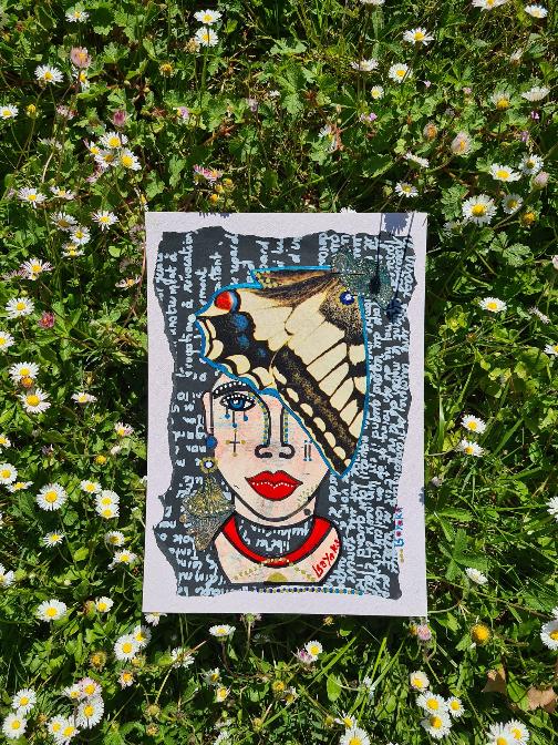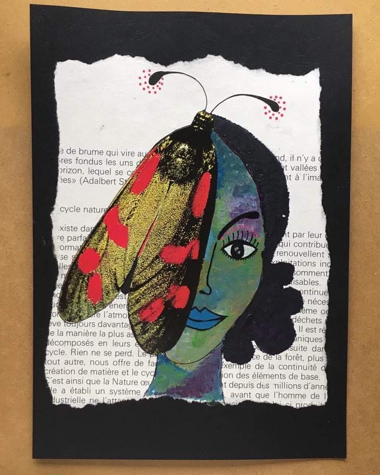 Pajaritos, 30x40cm, acrylique, papier teinté de sang des menstrues, collageMariposas, 30x40cm acrylique et collage sur papier