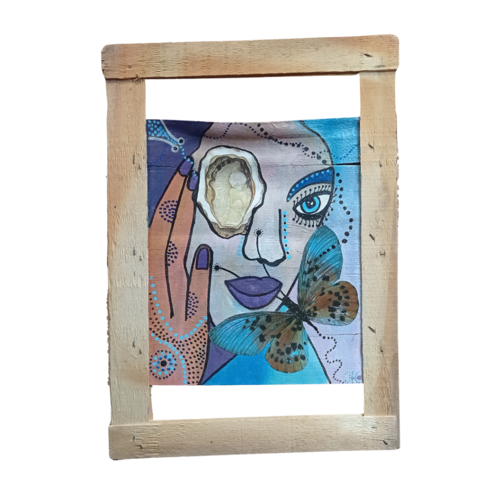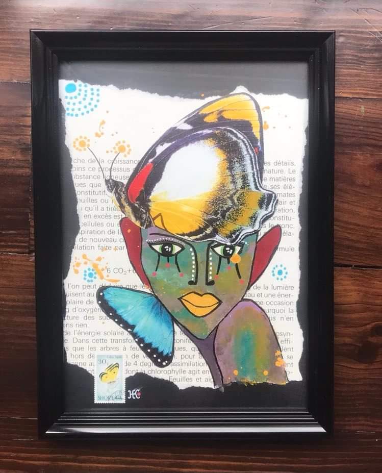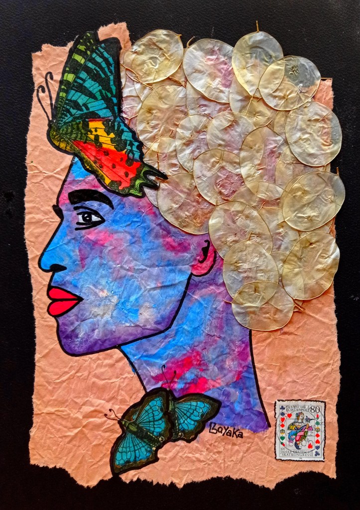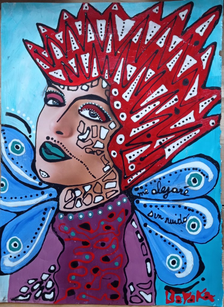 Pajaritos, 30x40cm, acrylique, papier teinté de sang des menstrues, collageMariposas, 30x40cm acrylique et collage sur papier