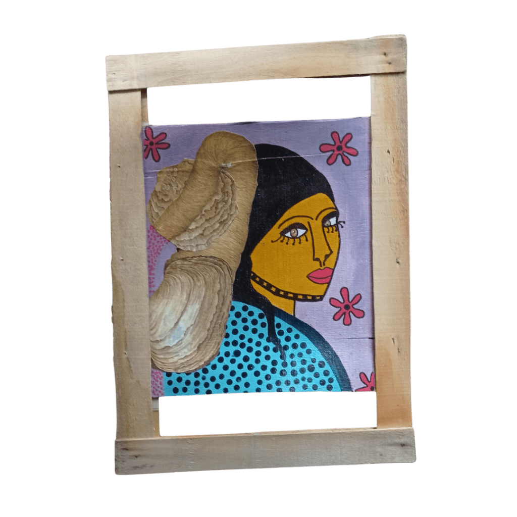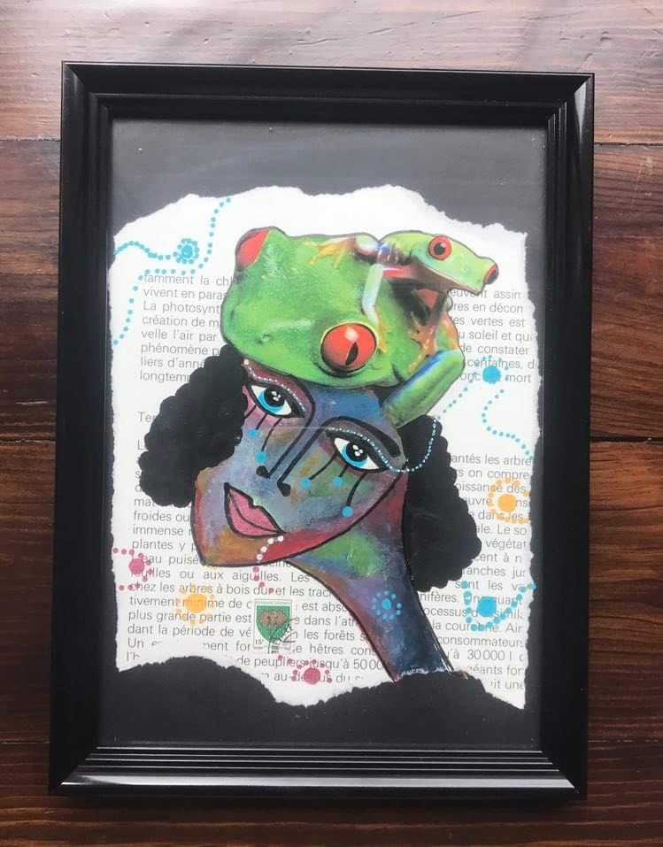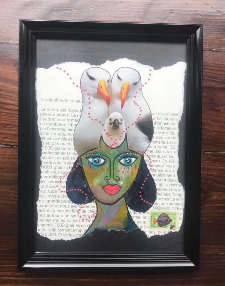 Nid d’oiseau, collage et acrylique sur papier, Cou de pieds, collage et acrylique sur papier teinté des menstrues,Bufanda de Loro, acrylique, collage, sur papier, 21×29,7cm, Rana, collage, acrylique sur papier, 21×29,7cm,