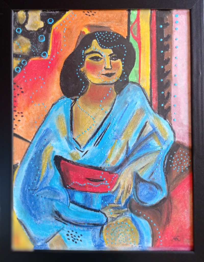 Horizon, 24x32cm, pastels secs sur papierIci et maintenant, 30×30 (dyptique), acrylique sur toileL’algérienne (d’après Matisse), 30x40cm, pastels secs et acrylique sur papier, encadré noir